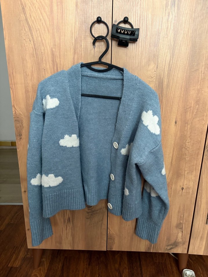 Mavi renkte, beyaz bulut desenli, bol kesim triko hırka. Uzun kollu, normal boyda ve yakası kesimli, günlük kullanıma uygun rahat bir parça. ☁️