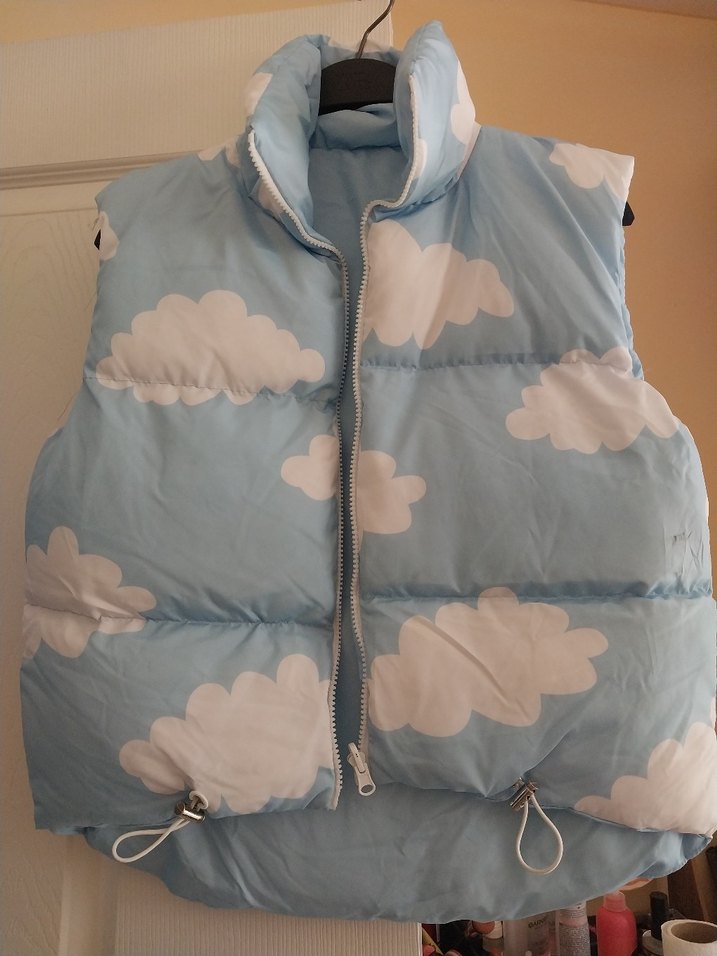 Çift Tarflı Yelek Standart Yüksek yakalı, şişme ve bol kesim mavi yelek. Yumuşak ve sıcak kumaştan, beyaz bulut desenli, rahat ve gündelik kullanım için uygun. ☁️