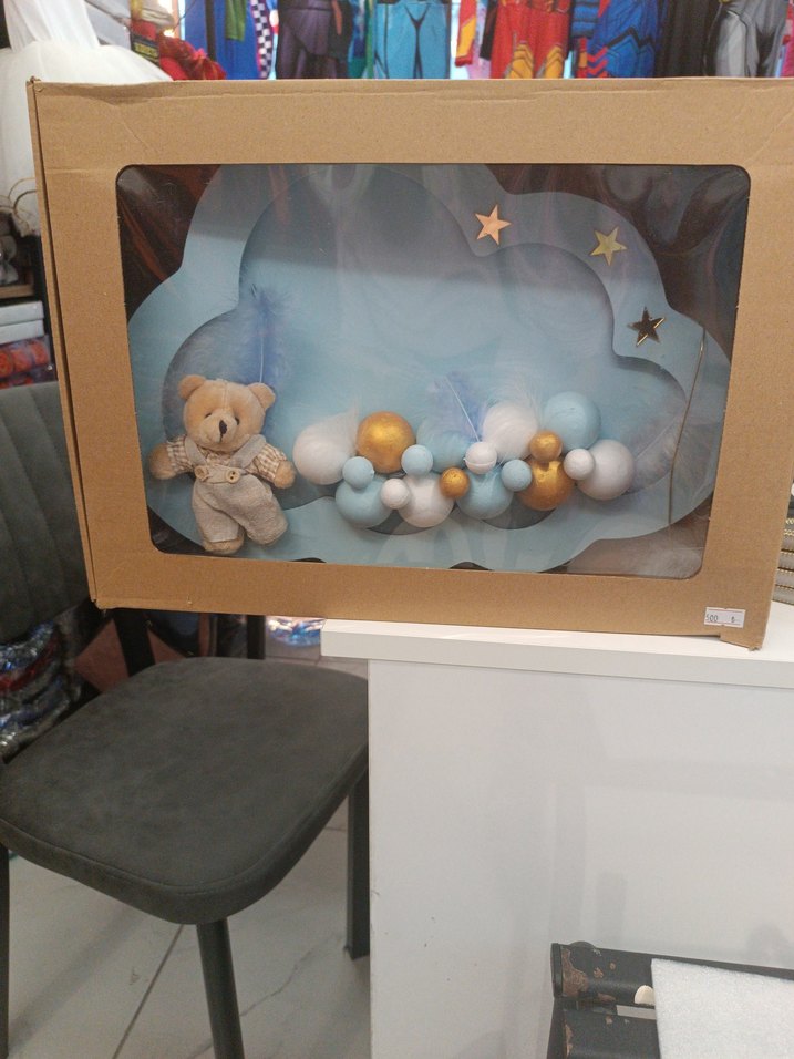 Mavi renkte bulut şeklinde çocuk rafı, yıldızlar, renkli toplar ve küçük bir oyuncak ayı ile süslenmiştir.