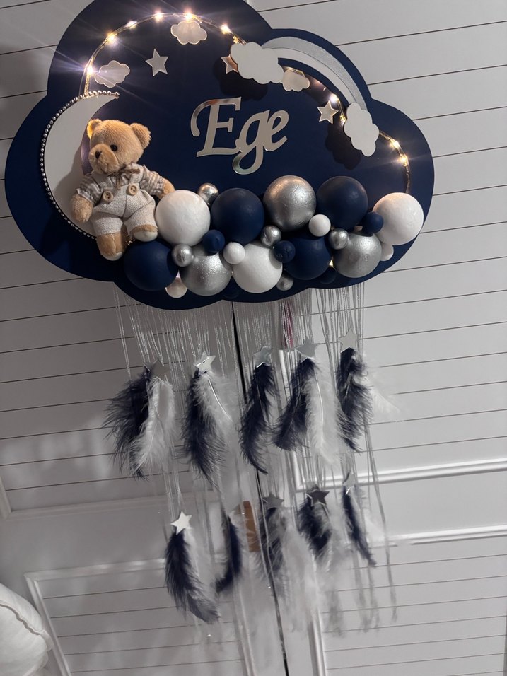 Mavi bulut şeklinde, üzerinde "Ege" yazan, ayıcık ve yıldız süslemeleri bulunan, tüylerle asılan dekoratif çocuk odası süsü. Sadece hastane odasında kullandım jelatinleri bile sökülmemiş ismi çıkartıp kendi bebeğinizin isim baskısını yapıştırabilirsiniz yardımcı olurum