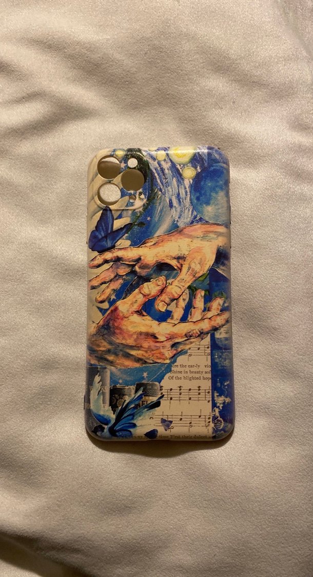 Mavi renkli, butonlu ve counterculture tarzında, eller ve kelebek desenli telefon kılıfı.