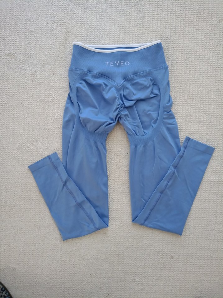 Mavi renkte, büzgülü tami boyda, sentetik kumaştan yapılmış, TEVEO logosu bulunan tayt. Spor ve sokak tarzına uygun.