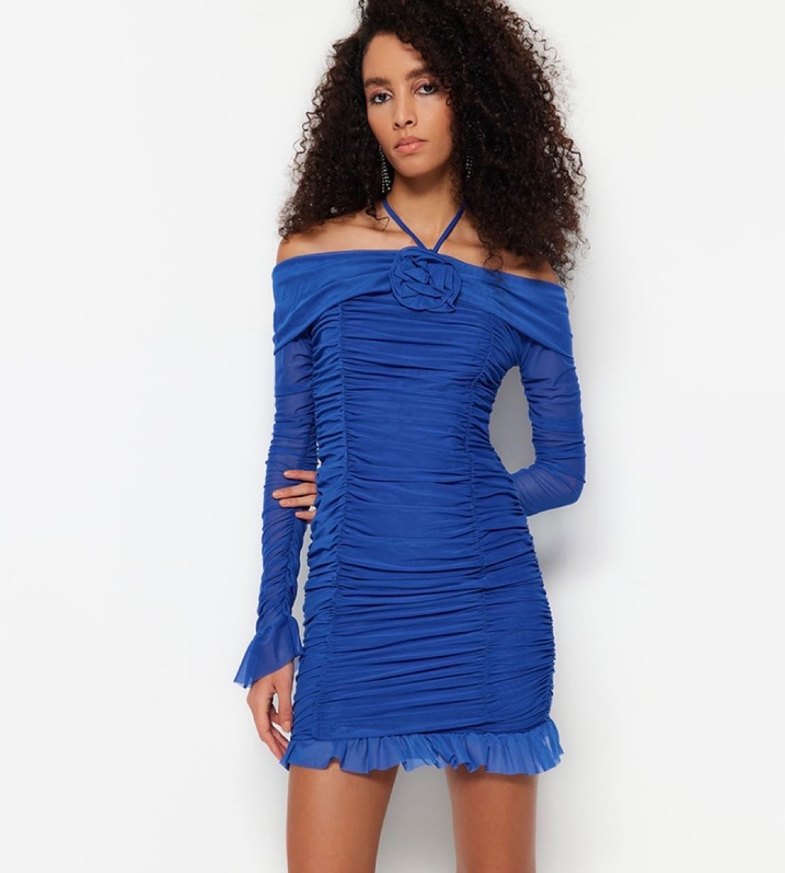 Büzgülü ve fırfırlı, uzun kollu, tek omuz açık, parlak mavi mini elbise, romantik akşamlar için uygundur. Trendyolmilla 36 beden şık elbise