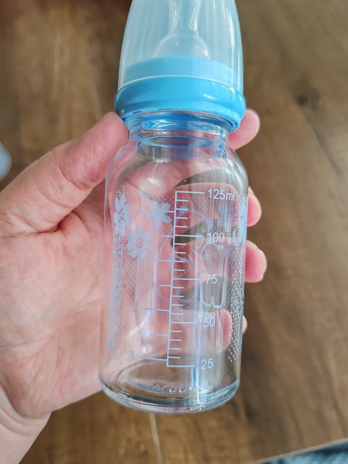 125 ml kapasiteli, ölçü işaretli ve yumuşak emzikli pastel mavi bebek biberonu.