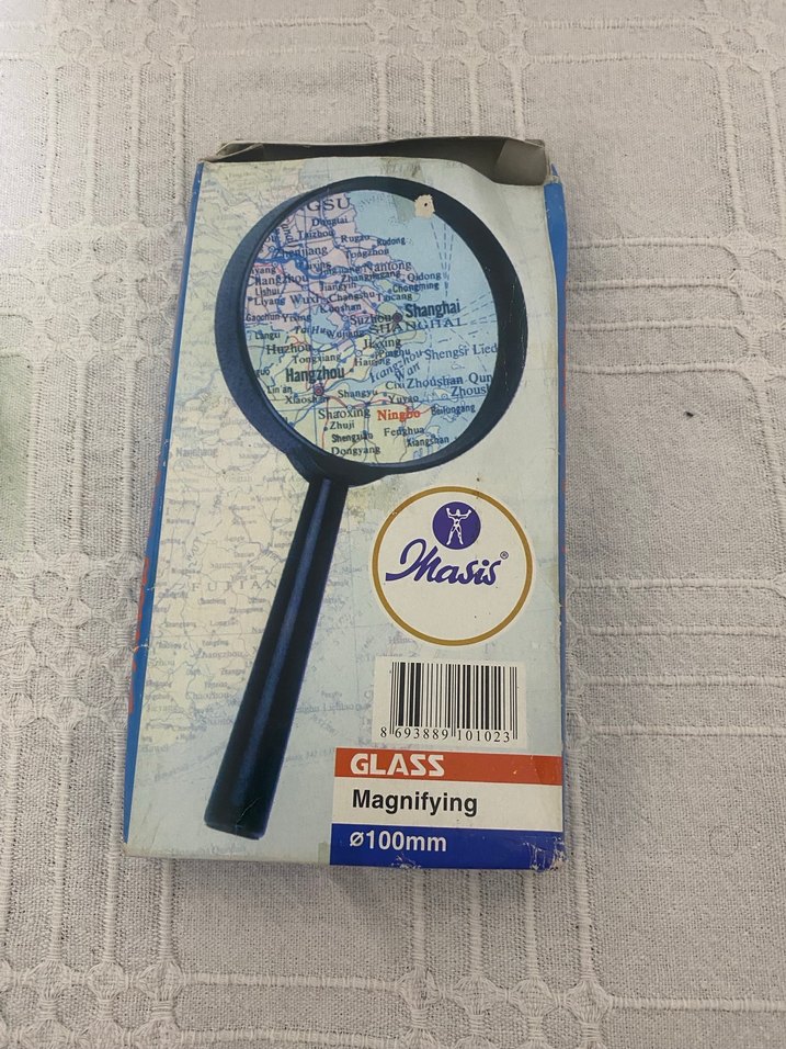 Hasis büyüteç, 100mm cam lens ve mavi sap ile net büyütme sağlar.