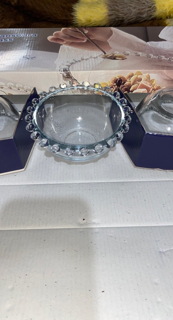Mavi camdan yapılmış, işlemeli görünümlü boncuk detaylı çağdaş kase seti.