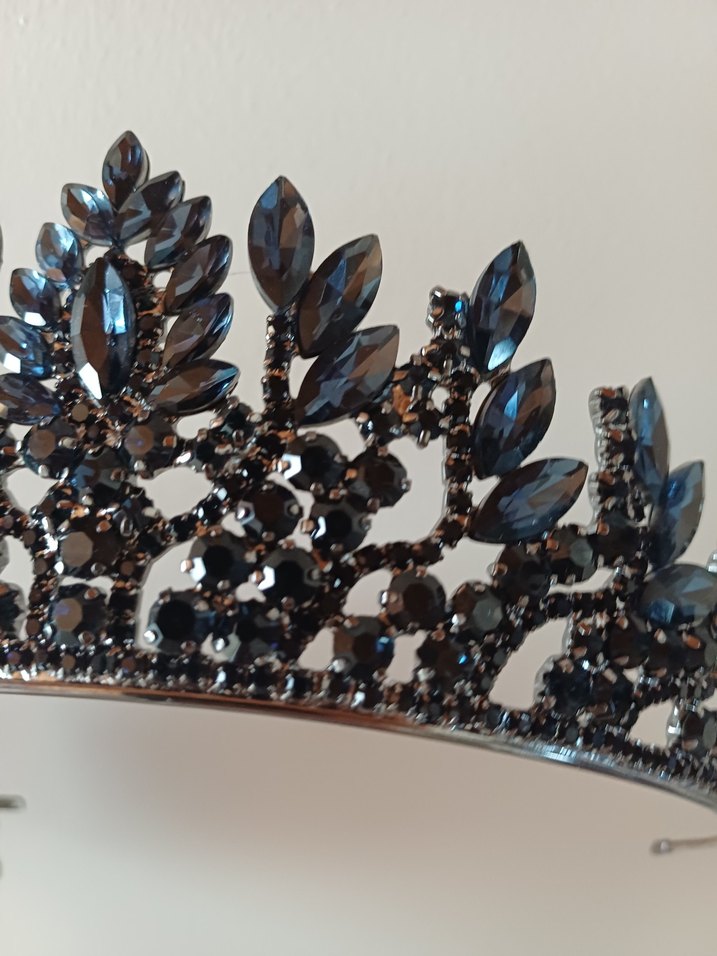 Koyu mavi cam taşlarla süslenmiş, gotik tarzda klasik şıklık sunan saç aksesuarı. ✨ küçük bir taşı düşmüş durumda. sadece 1 defa kullanıldı.