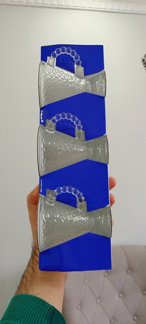 Mavi zemin üzerinde dokulu yüzeye ve boncuklu saplara sahip üç adet şeffaf cam bardak seti. Şık içecek sunumu için uygundur.
