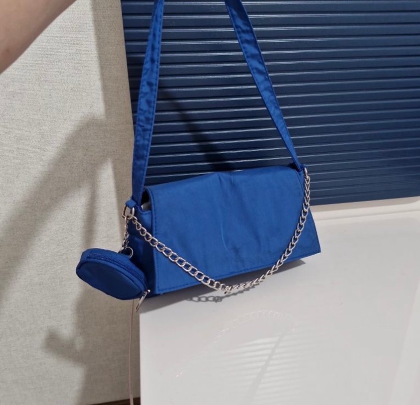 Parlak mavi renkte, zincir detaylı, yumuşak sentetik kumaştan kadın çantası. Günlük sokak stiline uygun.