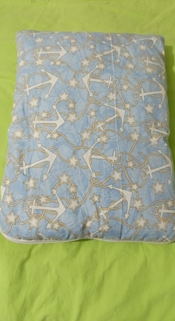 Pastel mavi renkte, çapa ve yıldız desenli yumuşak çocuk yastığı kullanılmadı uzunluk 50 genişlik 32 cmdir