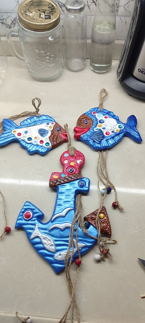 Renkli detaylara sahip mavi çapa ve balık figürlü bohem dekorasyon ürünleri, asma ipleriyle hareket katıyor.