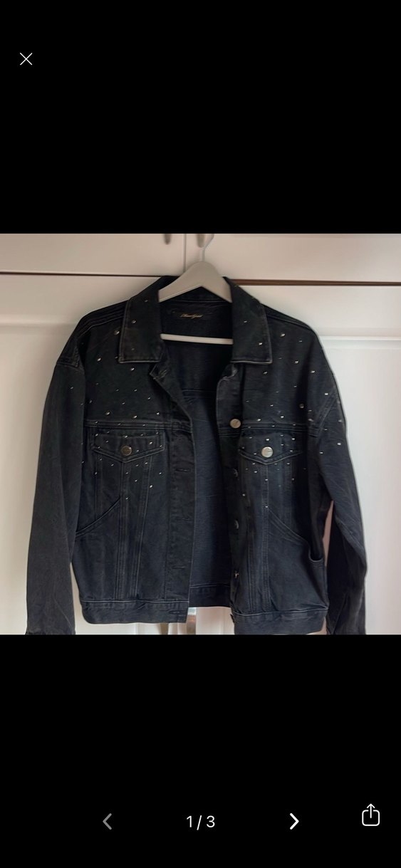 Siyah düğmeli, bol kesim kadın denim ceket. Notlu yakalı ve uzun kolludur, küçük zımbalarla süslenmiştir. Sokak stiline uygundur.