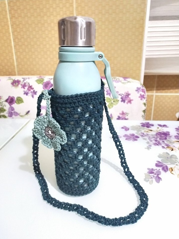 Mavi çelik termos şişe, çiçek süslemeli gri el örgüsü kılıf ve taşıma askısıyla birlikte gelir.