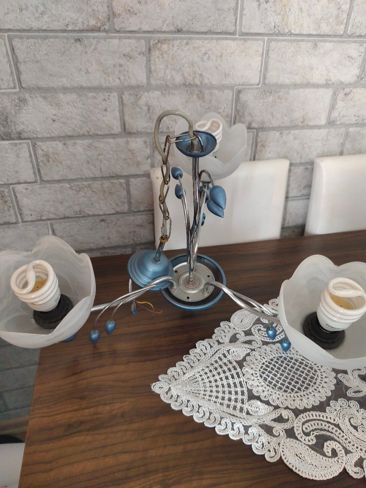 Mavi renkte, çiçek şeklinde ışık kapakları ve zarif yaprak detayları olan metal çerçeveli avize lambasıdır. Her odaya dekoratif bir dokunuş katar.