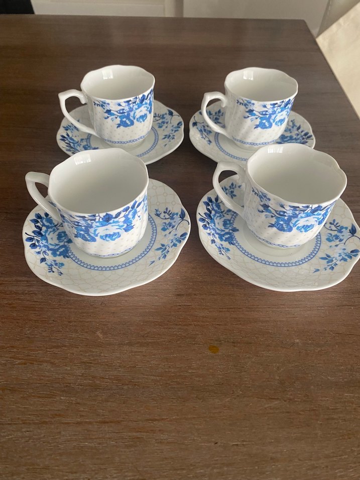 Dört adet porselen fincan ve tabağından oluşan set, koyu mavi çiçek desenlerine sahiptir. Her fincanın uyumlu tabağı bulunmaktadır. ☕ Tantitoni
