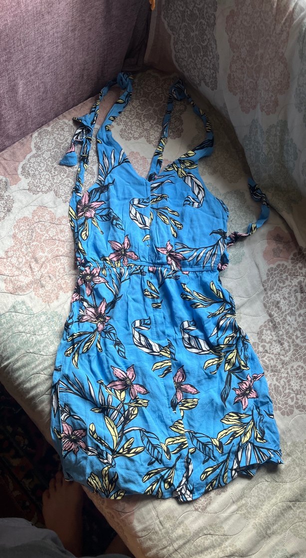 Renkli mavi çiçek desenli, askılı ve drapeli, vücuda oturan midi boy elbise, yumuşak sentetik kumaştan üretilmiştir.