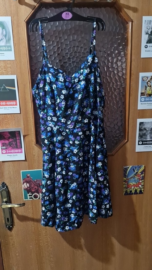 Mavi çiçek desenli, askılı, bol kesim midi elbise. Drapeli yakaya ve yumuşak sentetik kumaşa sahip. Bohem tarz için uygun.