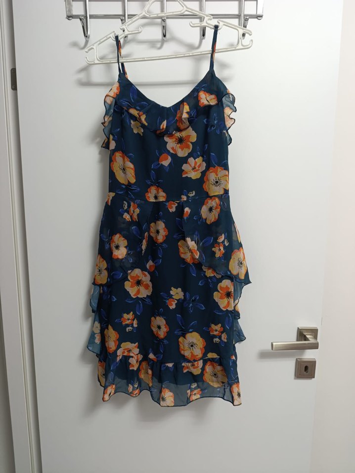 Mavi renkte, askılı ve straplez yaka detaylı, çiçek desenli ve fırfırlı midi boy elbise. Sentetik kumaştan yapılmış, bohem tarzda parti elbisesi.