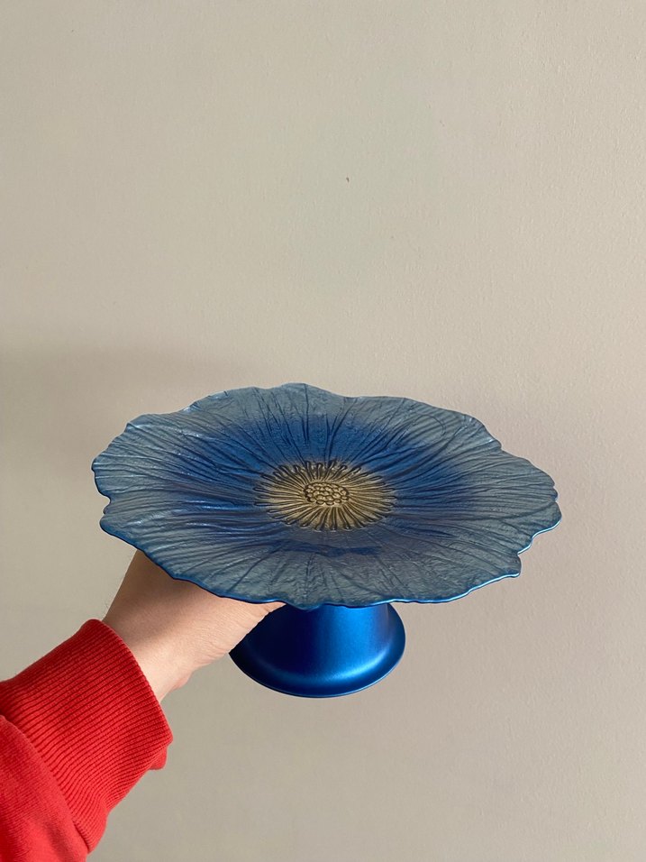 Koyu mavi renkte, çiçek desenli ayaklı tabak, detaylı yaprak tasarımı ile masanıza farklı bir hava katıyor. Bir kez kullanıldı çizik mizik hiçbir şey yok english home marka
