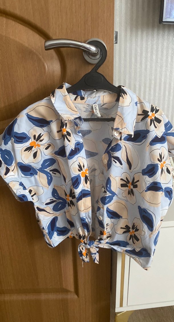 Pamuklu, kısa kollu, yakalı, düğmeli ve belden bağlamalı, bol kesim mavi çiçek desenli kadın gömleği.