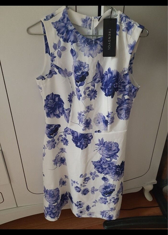 Mavi çiçek desenli beyaz elbise