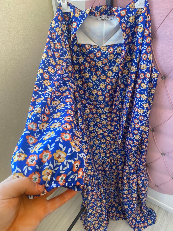 Renkli mavi çiçek desenli bol kesim, ve drapeli V yaka tasarıma sahiptir. Günlük kullanıma uygun bohem tarzda.