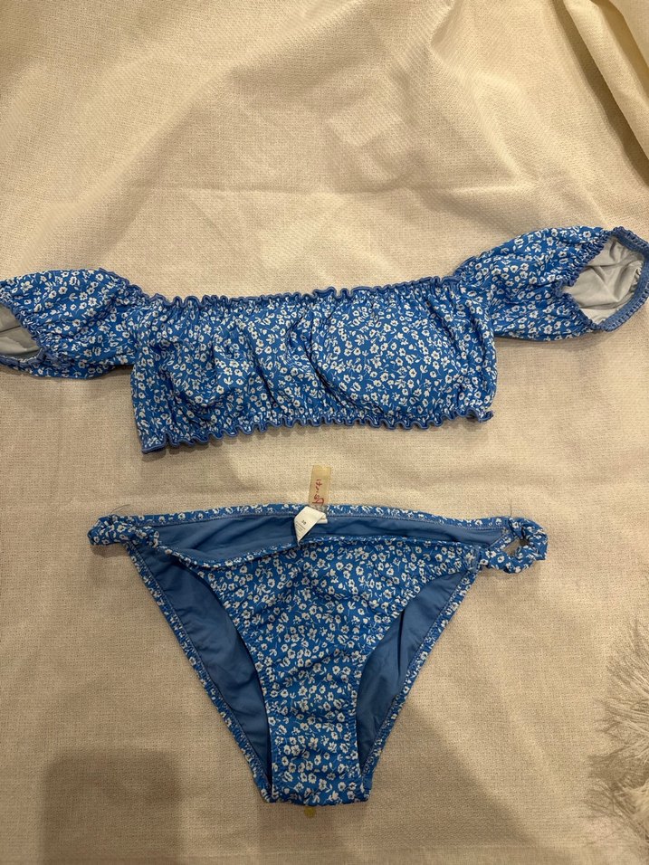 Bu mavi bikini, bohem tarzda, fırfırlı kenarlar ve narin çiçek desenine sahiptir. Askılı kollu ve midi uzunluktadır, plaj için uygundur.