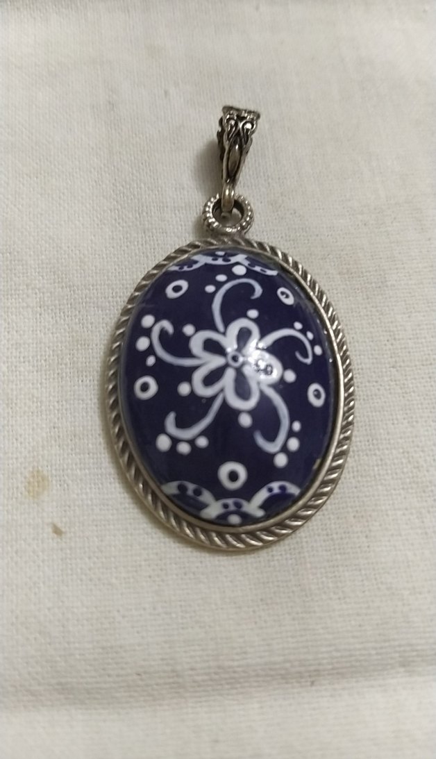 Bu bohem tarz gümüş kolye, koyu mavi çiçek desenli boncuklu vintage görünüme sahiptir.