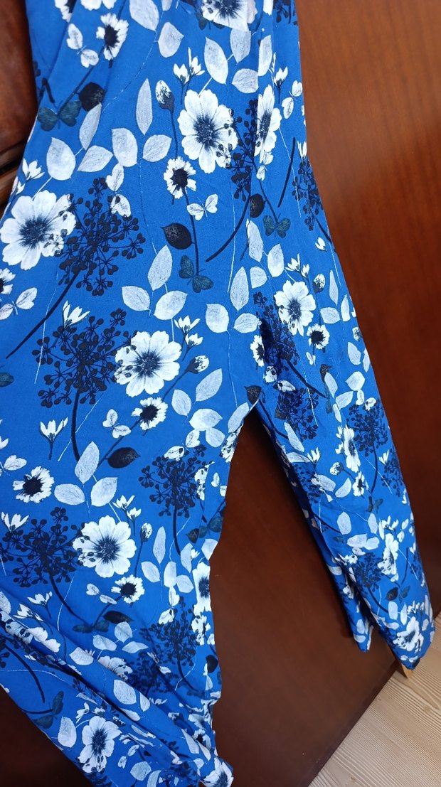 Koyu mavi renkli, çiçek desenli, straplez ve kolsuz bohem tarzda, drapeli ve vücuda oturan hamile tulumu.
