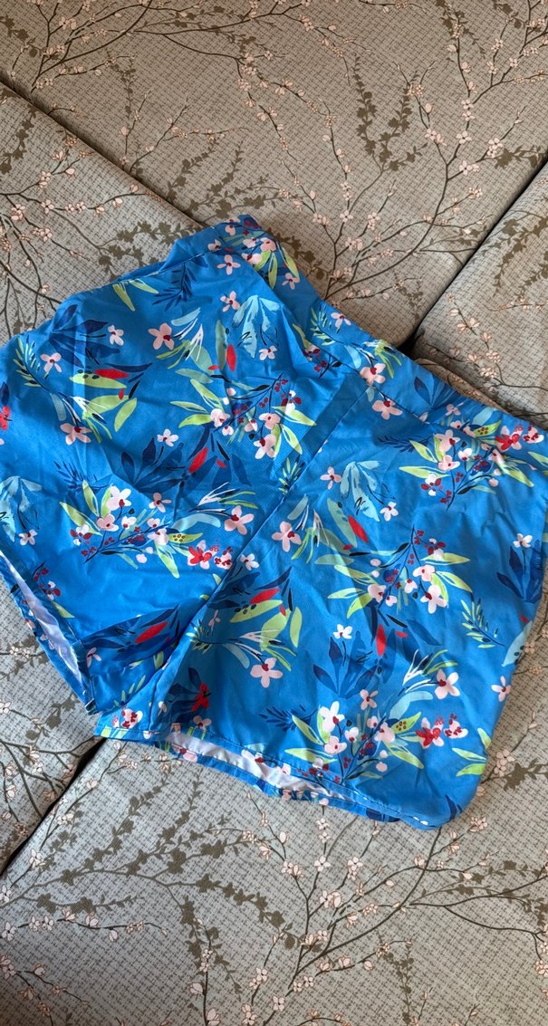 Renkli çiçek desenli, mavi zeminli bol kesim kadın mayo şortu. Drapeli tasarımıyla plajda bohem tarzı sunar.