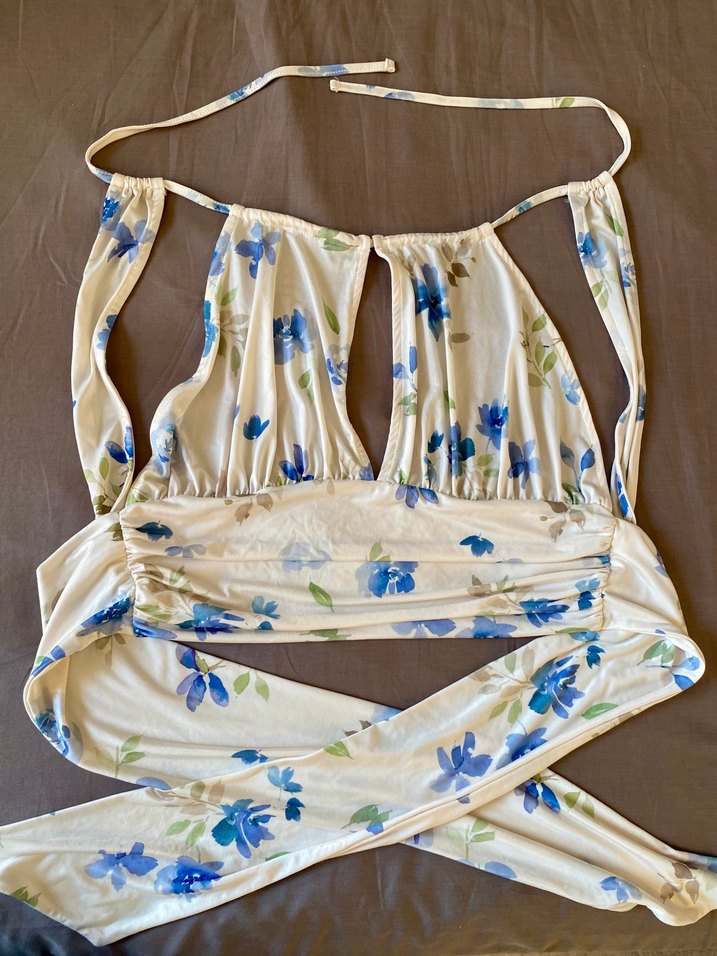 Hiç giyilmememiştir. Hafif mavi çiçek desenli, bohem tarzda vintage midi uzunlukta büstiyer. Ayarlanabilir askılar ve yumuşak kumaş içerir. Spor veya şık kombin yapmaya uygun. Keyifle giyineceğine eminim