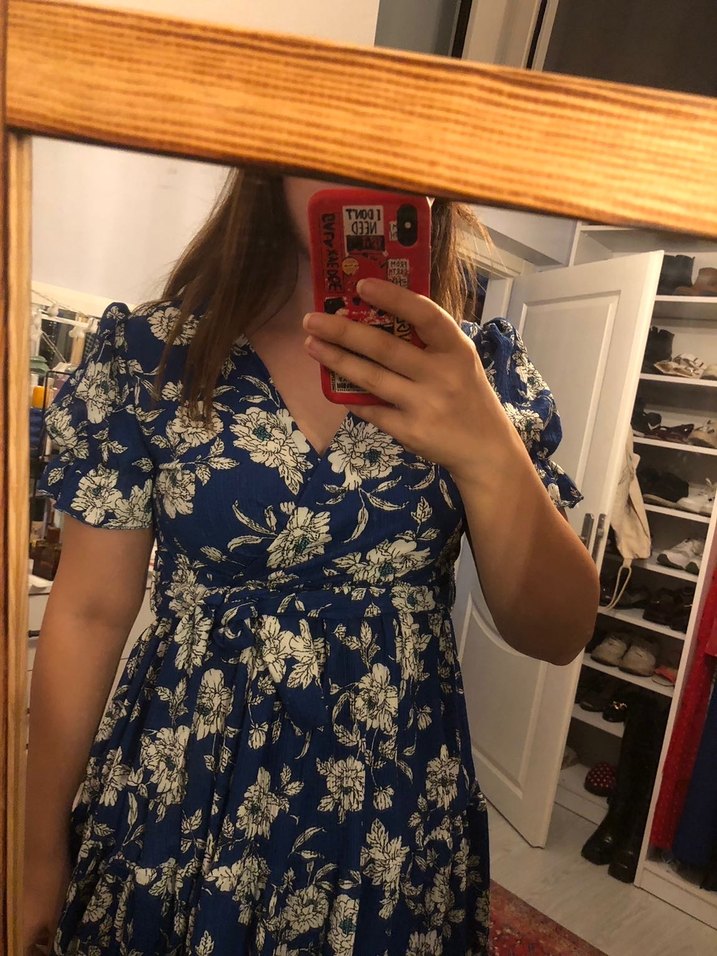 Mavi, çiçek desenli, düğmeli, V yaka ve kısa kollu, yumuşak denim kumaştan bohem tarzda fitted midi elbise. Romantik akşamlar için uygun. Ben bir defa giydim elbisem oldukça var İhtiyaç fazlası olduğu için yükledim Çok iyi durumda giyilmemiş gibi