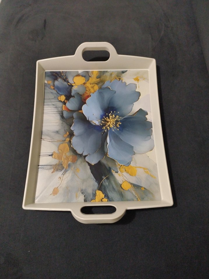 Canlı mavi çiçek deseni ve gri çerçeveli bohem tarzda, tutma saplı tepsi. Servis veya dekorasyon için uygun.