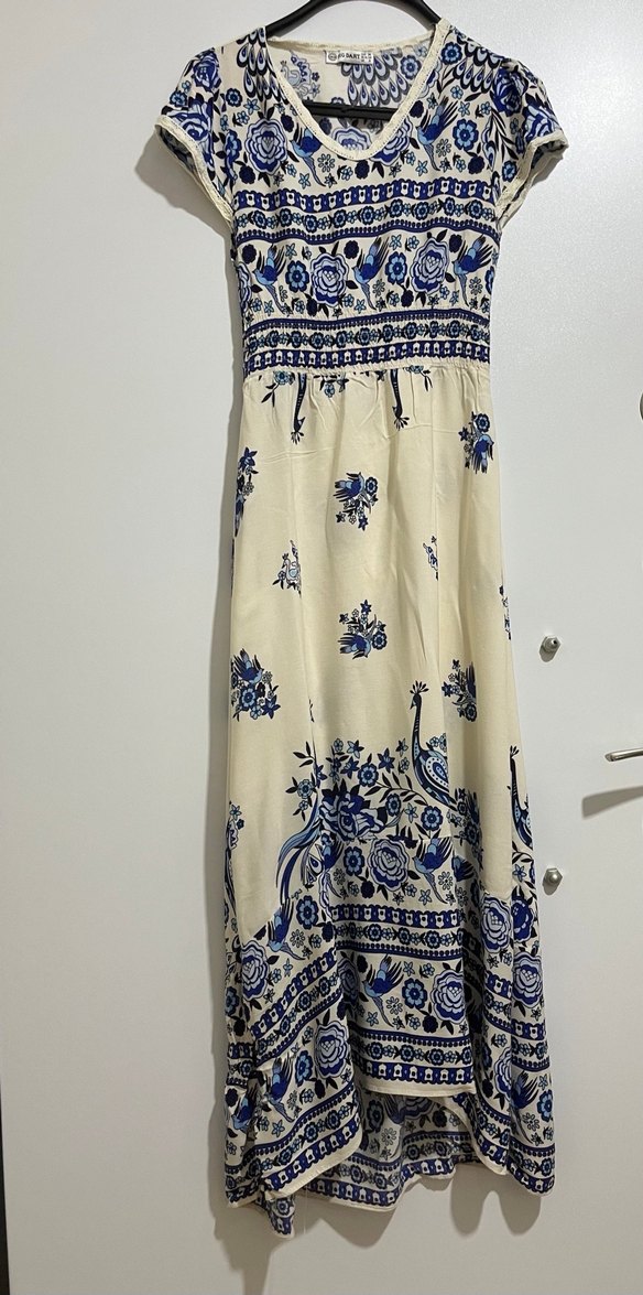 Az kullanıldı. Mavi çiçek desenleri ve fırfır detaylarıyla uzun, bol kesim, kayık yaka ve kolsuz elbise. Hafif sentetik kumaştan, bohem tarz için uygun.