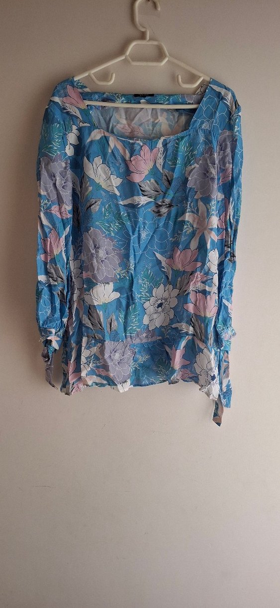 Mavi, pastel çiçek desenli, uzun kollu, tekne yaka, bol kesim, dökümlü bohem bluz. Sentetik kumaştan, günlük kullanıma uygun.Geniş kalıp