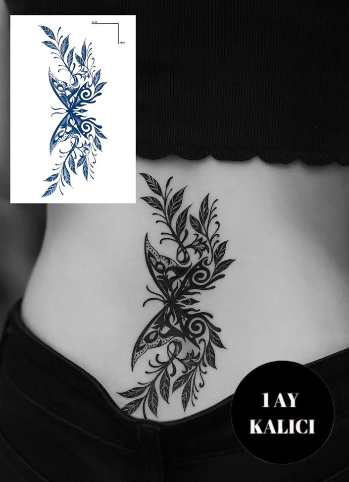 Mavi çiçek desenli bu bohem vücut dövmesi, dantel esintili ve koyu tonludur. Minimalist ve retro tarzlara uygundur, 1 ay kalıcıdır.