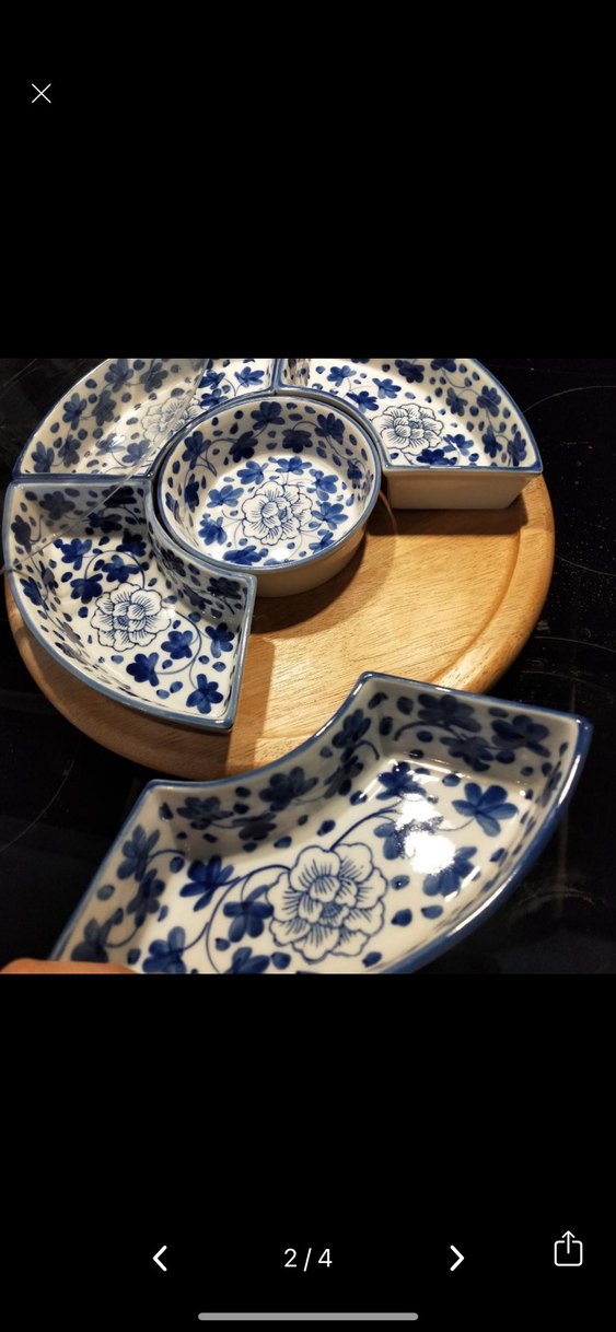Ahşap taban üzerinde yer alan, koyu mavi çiçek desenli, çok bölmeli seramik tabak seti, atıştırmalıklar için uygundur. ️yurtdışından aldım