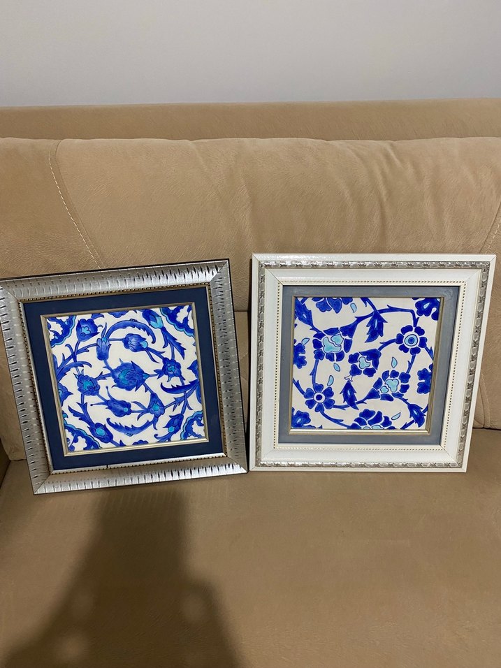 İki adet beyaz zemin üzerinde koyu mavi çiçek desenli, gümüş ve beyaz çerçeveli tablolar seti.