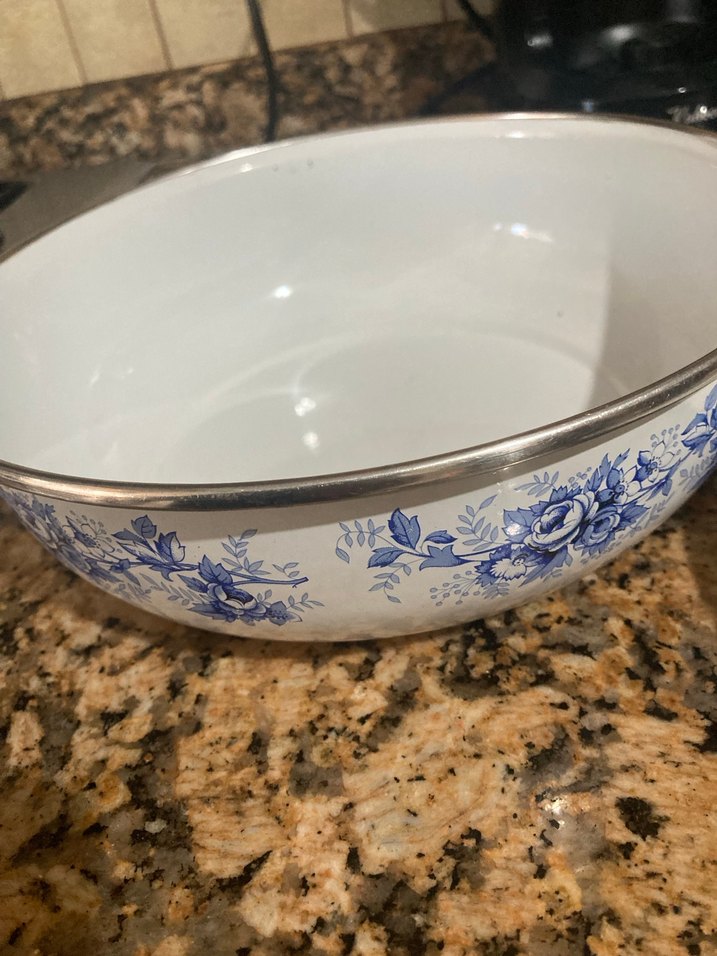 Parlak mavi çiçek desenli seramik kase, gümüş renkli kenarlığa sahip.