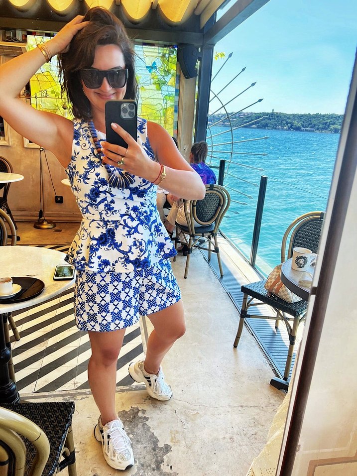 Mavi çiçek desenli, kolsuz ve dantelli, normal midi uzunlukta, ince kesim bluz. Modern klasik tarzıyla ofis kullanımı için uygundur.
