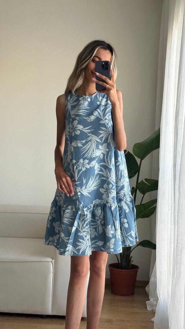 Mavi çiçek desenli, kolsuz, bol kesim mini elbise, alt kısmında fırfır detayı ile yumuşak sentetik kumaştan üretilmiştir.