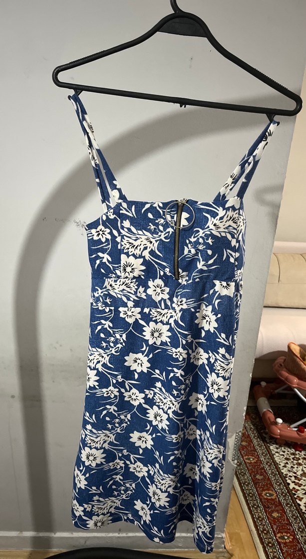 Mavi denim kumaştan, beyaz çiçek desenli, straplez yaka ve ince askılı, önden fermuarlı, bohem tarzda midi boy elbise.