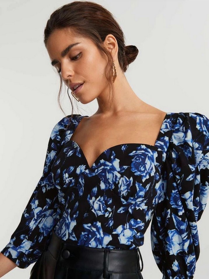 Ukranya’dan almıştım düğmesi bile duruyor hiç kullanılmadı V yaka ve uzun kollu, drapeli kesime sahip oturan bluz. Koyu mavi çiçek desenli, ipeksi kumaştan, romantik akşamlar için uygun.