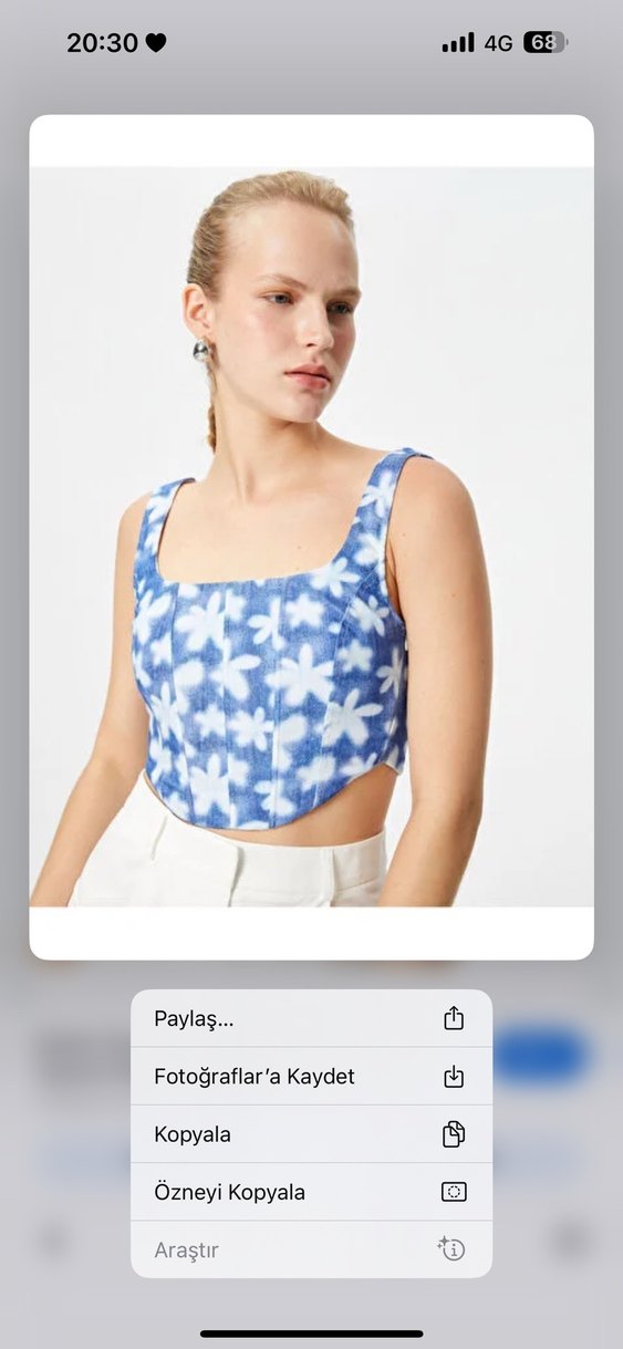 Mavi çiçek desenli, düğmeli ve kısa kesim bustiyer. Askısız, kolsuz ve vücuda oturan yapıda, günlük kullanıma uygun.