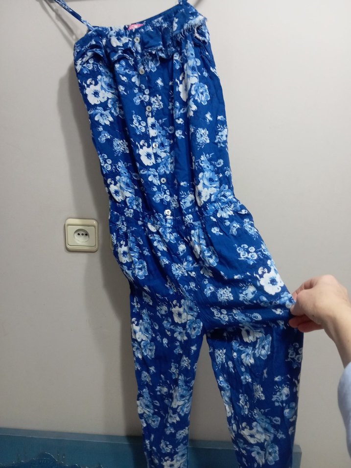 Rahat kesim, askısız ve düğmeli, mavi çiçek desenli tulum. Günlük rahat kullanım için uygundur. iadesi yoktur iki koltuk arası 39 bel 40 basen 43 cm boy 156 cm dir on fırfırin ucunda sadece sökülme var oda terziye diktirilebilir iki tarafında cep vardır askılar ise ayarlıdır