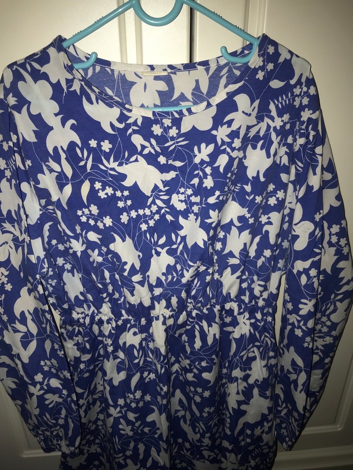 Mavi çiçek desenli elbise uzun kollu ve V yaka. Salaş kesim ve drapeli tasarıma sahip, bohem tarz için uygun.