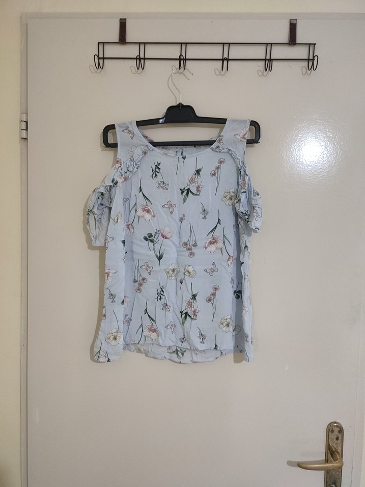 Mavi, çiçek desenli, askısız ve kolsuz, bol kesim bluz. Fırfır detaylıdır, viskondan yapılmıştır, günlük rahat kullanım için uygundur.