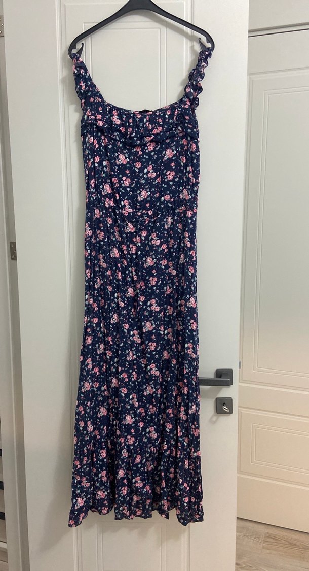 Mavi çiçek desenli, volan detaylı, rahat kesim uzun eteği. Yumuşak dokulu kumaştan, romantik akşamlar için bohem tarz sunar.