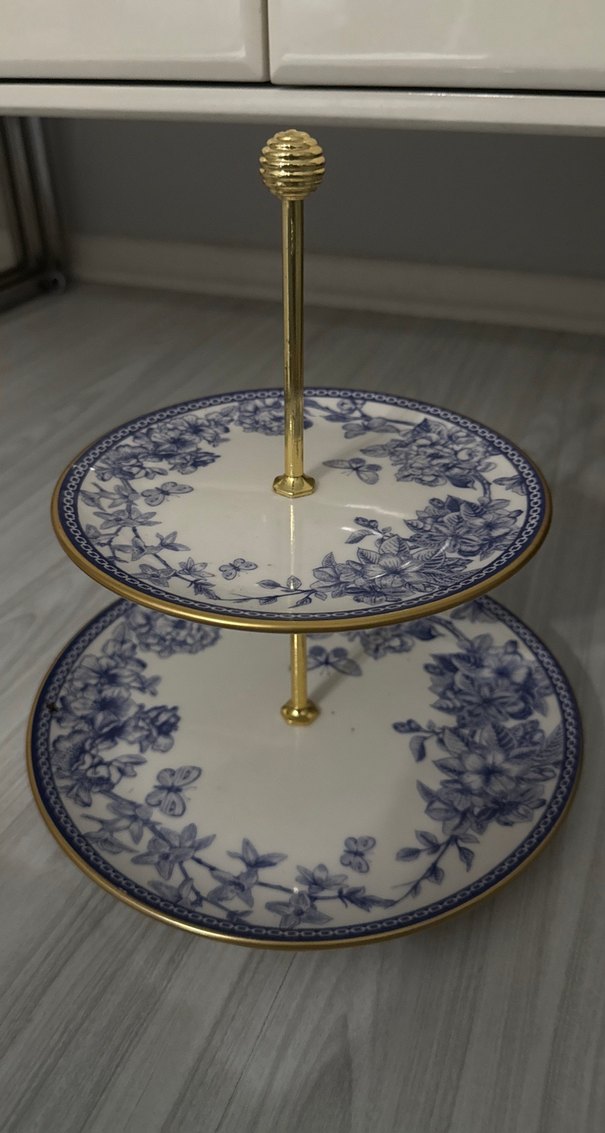 Mavi çiçek desenleri ve parlak altın detaylara sahip iki katlı servis tabağı, tatlı veya atıştırmalıklar için uygundur.