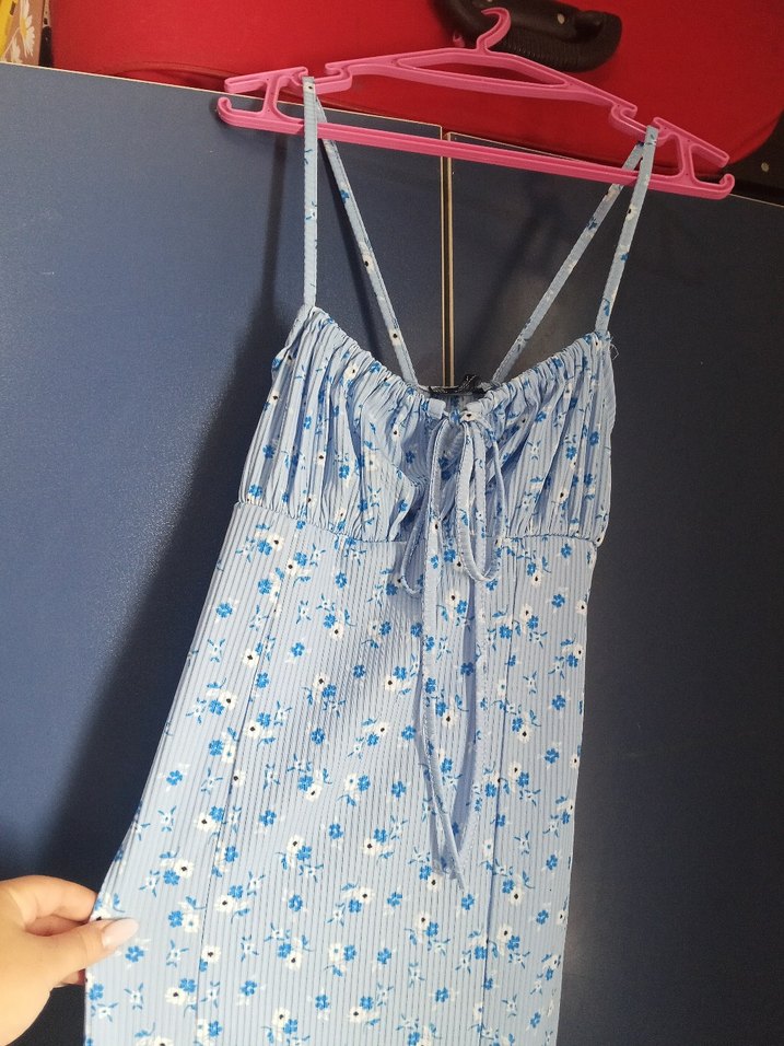 İp askılı, drapeli ve pastel mavi çiçek desenli, bohem tarzda fit kesim midi elbise.